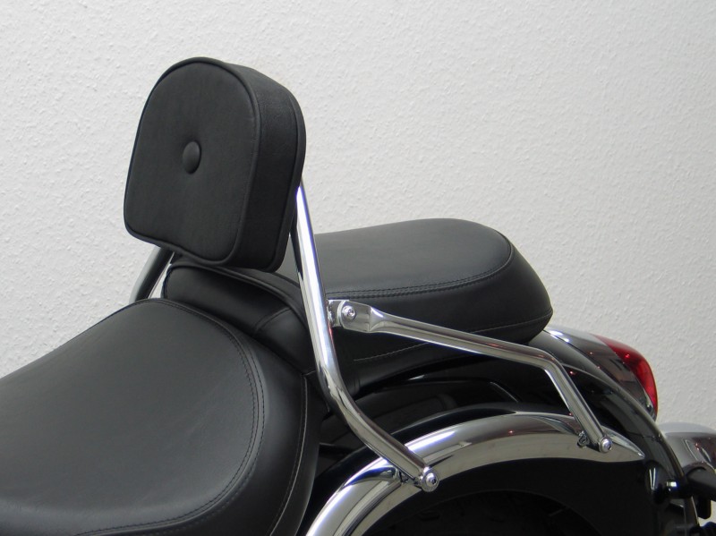 Chrome plated Solo driver backrest and luggage rack. Driver Sissy Bar 20 cm high, made of Chrome Plated tubular Steel, with pad and carrier Max. load 5 kg. Fits in front of the passenger seat. Kawasaki VN900 Classic Motorcycle Accessory