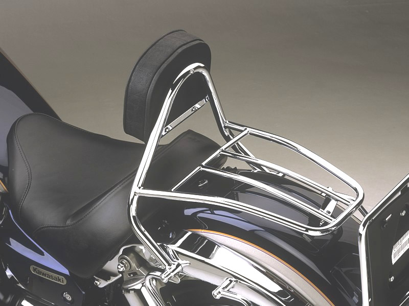 Chrome plated Solo driver backrest and luggage rack. Driver Sissy Bar 20 cm high, made of Chrome Plated tubular Steel, with pad and carrier Max. load 5 kg. Fits in place of the passenger seat. Kawasaki VN1600 Classic Motorcycle Accessory