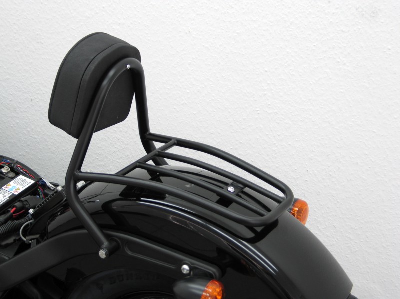 Black Finish Solo driver backrest and luggage rack. Driver Sissy Bar 20 cm high, made of tubular Steel, with pad and carrier Max. load 5 kg. Fits in place of the passenger seat.