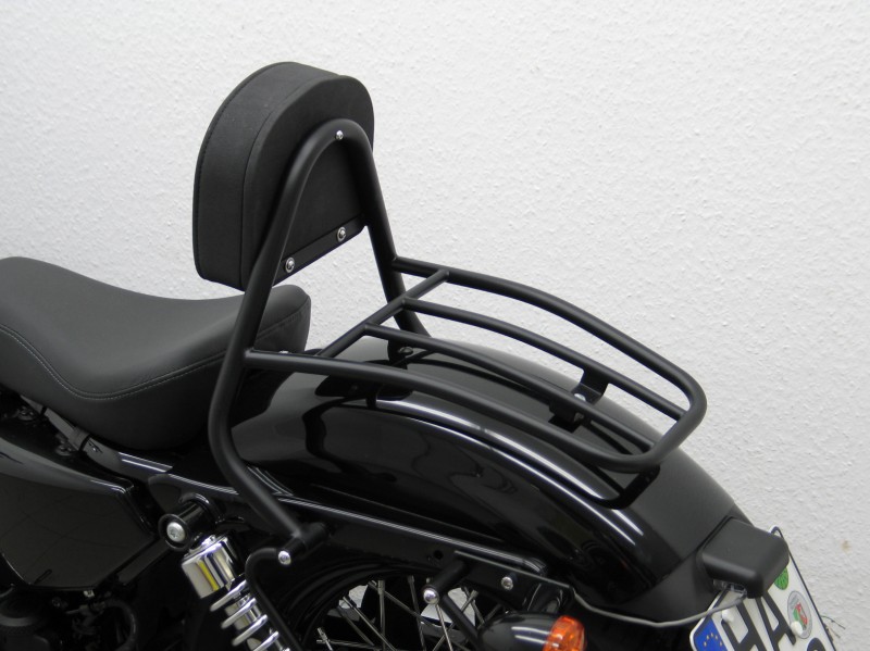 Black Finish Solo driver backrest and luggage rack. Driver Sissy Bar 20 cm high, made of tubular Steel, with pad and carrier Max. load 5 kg. Fits in place of the passenger seat.