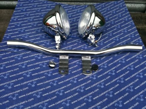 Triumph America passing driving light kit a set of 2 spotlamps and mounting bracket for your bike from Magnum Accessoires Gives your America a classic look as well more than doubling your forward and side illumination of the highway. This triple chrome-plated, billet aluminum design - includes 4.5" 34-watt driving lights, turn signal relocation adaptors, on-off switch, and all wiring. The set is compatible with all windshields. All the wires are concealed in the lightbar, lights are spaced at 22" centre-to-centre