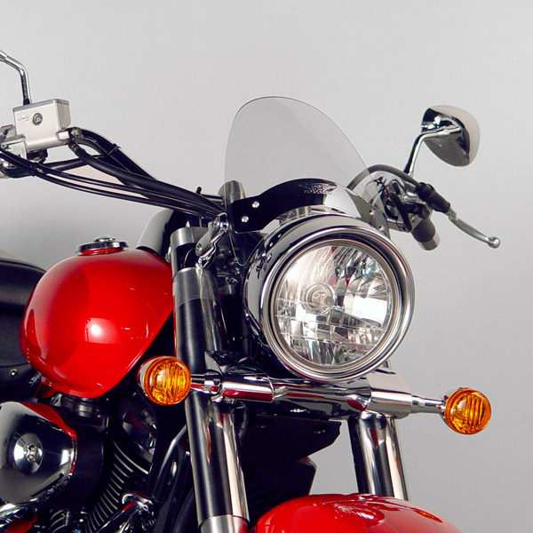 The Flyscreen is a stylish item for custom cruisers, muscle bikes and performance machines. The clean, minimal appearance and chrome trim plate will enhance the look of your bike. The quality Linking Arm fork mount system with countersunk screws offers a custom fit for motorcycles with open front forks.