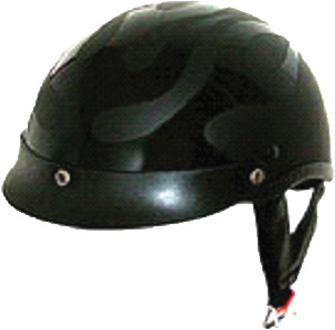 Matte black Flames on Black background, Trooper Style motorcycle helmet. Y-strap with quick release Great looking! Note: This helmet meets DOT standards (US Legal).