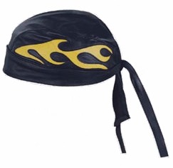 Classic black leather headwrap with yellow flame inlay on both sides, one size fits all. Looks great for posing in or keeping your hair on whilst riding your tryke.