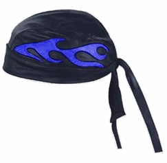 Classic black leather headwrap with yellow flame inlay on both sides, one size fits all.  Looks great for posing in or keeping your hair on whilst riding your tryke.