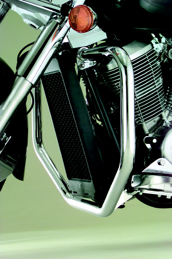Show Chrome steel tube Highway Bars. Front bars are a robust 1¼" in diameter. Mounts to existing holes in the front frame with included hardware. No drilling needed for installation.