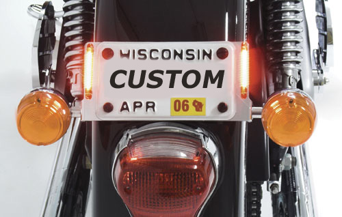 One of the easiest things you can do to customize and clean up the appearance of your license plate, turn signals and tail light. Replaces the stock license/turn signal mounting bracket, installs easily without any drilling, wire cutting etc. It lays the license plate down against the fender and brings the turn signals in 4". It is laser cut from heavy gauge steel and triple chrome-plated. Also included is a set of our S.O.M.A. super bright, wide angle LED tail and brake lights. The seond most common motorcycle accident you are ever likely to face is being rear-ended and cruiser bikes are known for having small tail lights. While these LEDs are very small in size they give a huge increase in visibility to and safely from other motorists.