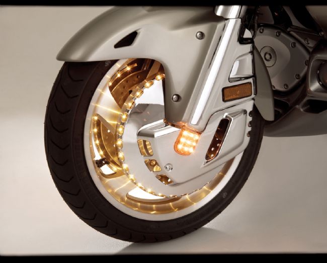 Honda Goldwing G1800 Rotor Covers Amber Lighted Front There are 38 LEDs in outer ring edge on each side. These lights aLSO SHINE IN TOWARDS WHEEL