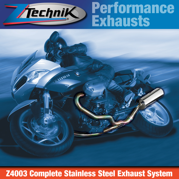 BMW R1200RT - Full Exhaust System, Stainless Steel Ztechnik Z4003 ultimate stainless power system ! Take a look at the new Z4003 Performance Exhaust System for the BMW R1200R/ST/RT. This sleek exhaust consistently provides a performance boost of 5 HP and 2 ft. lbs. of torque in a lightweight, well-engineered package. A close look at the quality shows no short cuts taken -- the craftsmanship of the entire system is refined for power and appearance. Equal length header pipes feature precision machined and welded couplers, providing you the benefit of a perfect fit and a tight, long lasting seal. The polished stainless steel muffler also features a removable dB Killer™ for an aggressive sound to match its performance. As with all ZTechnik Exhaust Systems, your engine warranty remains valid after the system is installed!