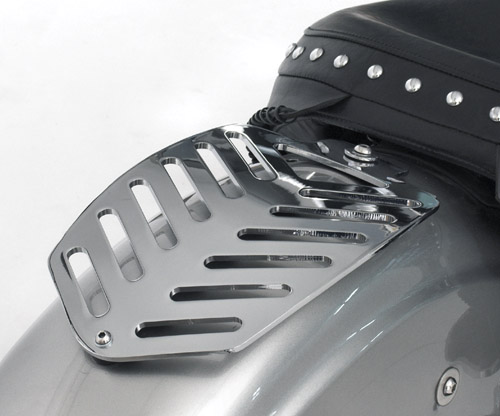 Laser cut, hand polished to a flawless finish and triple chrome-plated solo luggage rack. Mounts using the same two bolt holes as the stock passenger seat so you can switch back to the seat in minutes when you need carry a passenger.This is serious peice of steel and very strong.