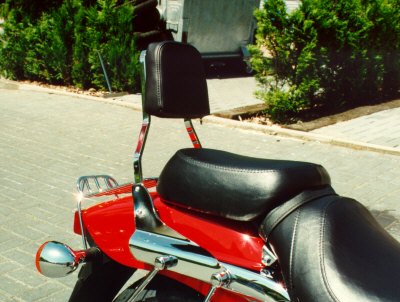 Complete Sissy Bar, including pad, with all necessary mounting materials.  Steel and stainless steel with surface treated with steel and stainless steel chromed.  The supplied sissy bar is mounted on existing mounting points on the bike.