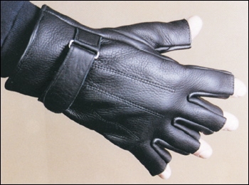 Biker Mustang 3/4 Fingerless Black genuine leather gloves with a full cuff and a velcro strap. The cropped and stitched finger tips offer the advantages of fingerless gloves.