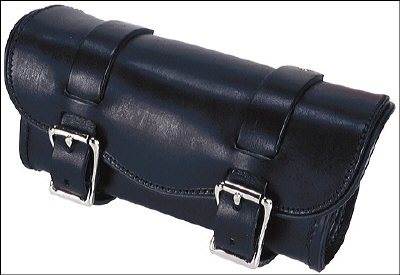 These synthetic leather tool pouches measure 9”W x 4 3/4”H x 5”D. They each feature black piping and are available with or without chrome studs (see other listing) . greatly improives the looks of your bike too! come with mounting straps to go around your forks too. Far better than cheap leather .