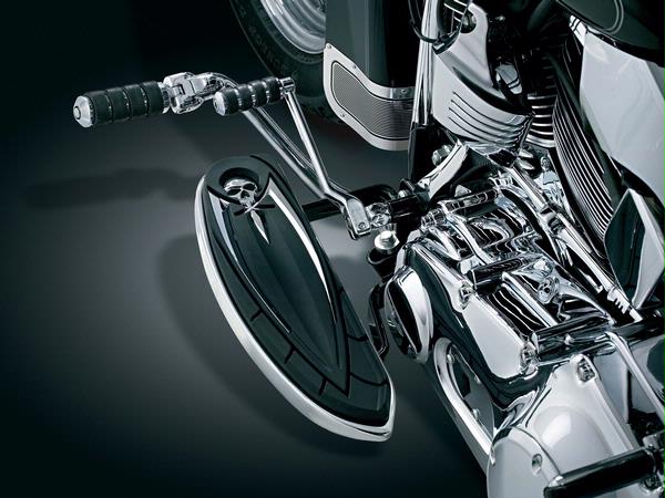 Let your sinister looking ride cross over to the dark side! These Floorboard Covers are the newest member of the Zombie family. Created from a sculpted black rubber pad with a chromed inlay, they cast a longer, fleeting shadow. The specially designed rubber pad also helps keep your boots off the pipes. Exorcism not included.