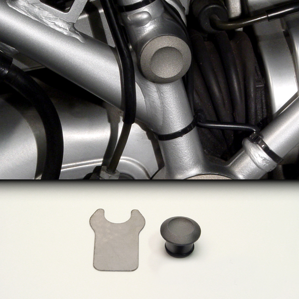 Cover the small hole at the right rear frame junction with this beautifully machined aluminium plug. It has a bead blasted, durable hard-anodized grey finish to match the Boxer's cylinder head covers. Precise tolerances and a channelled rubber o-ring ensure a perfect and exact fit.