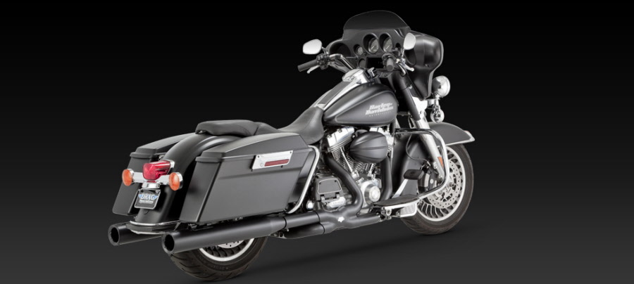 For the rider that commands a menacing presence we bring you our new Blackout Round 4” slip-ons. Coated with a durable high temperature black ceramic finish, the Blackout Rounds also include matte black CNC machined end-caps and matching Vance & Hines riveted logo badges in black. For a completely blacked out look, add the Vance & Hines Dresser Duals in black. Compatible with CVO drop skirt bags. Optional quiet baffles available for a throaty exhaust note and reduction of 3-5dB in the sound level.