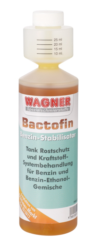 Example: 40 ml of Bactofin will be sufficient for a tank of 40 litres. Suitable for: 2- und 4-Takt-Motoren Way of application: Fuel system cleaning, Rust protection, Fuel stabilising, Valve protection Dosing: 1:1000 Flash point: > 65 °C Type of fuel: Benzin Viscosity (20°C, mm²/s): 10,38