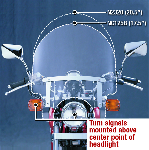 Designed for motorcycles with turn signals mounted above the centrepoint of the headlight. Height: 20.5 in. Width: 18.3 in. High quality, low cost alternative to a hardcoated polycarbonate windshield, and a better choice than regular acrylic. An excellent style, gives a custom look to many bikes with exposed forks, ideal windshield for smaller cruisers or standard styled motor cycles. Affords good wind protection and is a great choice for riders on a budget. Hard ware is included with windshield.